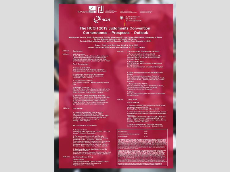 The Permanent Bureau is pleased to advise that registration is open for the Conference on The HCCH 2019 Judgments Convention: Cornerstones – Prospects – Outlook, which will be held in person on 9 and 10 June 2023 at the University of Bonn, Germany. The Conference is co-organised by the University of Bonn and the Permanent Bureau of the HCCH, with the generous support of the Federal Ministry of Justice of Germany.