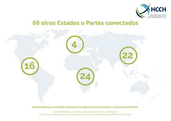 Los siguientes Estados (66) no son Miembros de la HCCH, sin embargo, han firmado, ratificado o se han adherido a uno o varios Convenios de la HCCH.