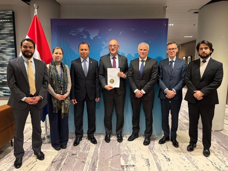 Lors de la cérémonie, qui s’est tenue au ministère des affaires étrangères des Pays-Bas, dépositaire des Conventions de la HCCH, El Salvador était représenté par S.E. M. Agustín Vásquez Gómez, Ambassadeur d’El Salvador aux Pays-Bas, M. Josué Roberto Liévano, Ministre conseiller à l’Ambassade d’El Salvador, et M. Daniel Starr Tenorio, Conseiller à l’Ambassade d’El Salvador. Le dépositaire était représenté par M. Jules van Eijndhoven, Chef de la Division des Traités, M. Rieks Boekholt, Conseiller juridique senior à la Division des traités, et Mme Ines Veldkamp, Chargée de mission pour El Salvador au Département de l’hémisphère occidental. Le Bureau Permanent de la HCCH était représenté par M. Philippe Lortie, Premier secrétaire (Juriste diplomate) et co-Responsable de la Division du droit international de la famille et de la protection des enfants, et M. Jean-Marc Pellet, Coordinateur iSupport.