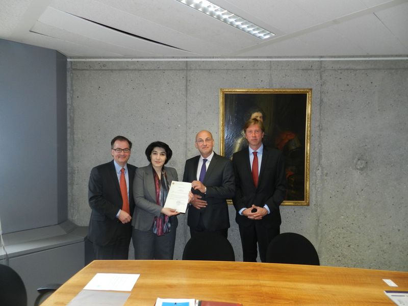 The Permanent Bureau is pleased to announce that on Tuesday 28 April 2015, Armenia deposited its instrument of acceptance of the Statute of the Hague Conference, and thus became the Conference's 79th Member. The Permanent Bureau was represented by the Secretary General, Mr Christophe Bernasconi, the Embassy of Armenia was represented by the Ambassador of Armenia, Her Excellency Ms Dziunik Aghajanian and the Minister-Counsellor, Mr Gevorg Petrossian, and the Ministry of Foreign Affairs of the Netherlands was represented by Mr Jules van Eijndhoven and Mr Mark Groen.